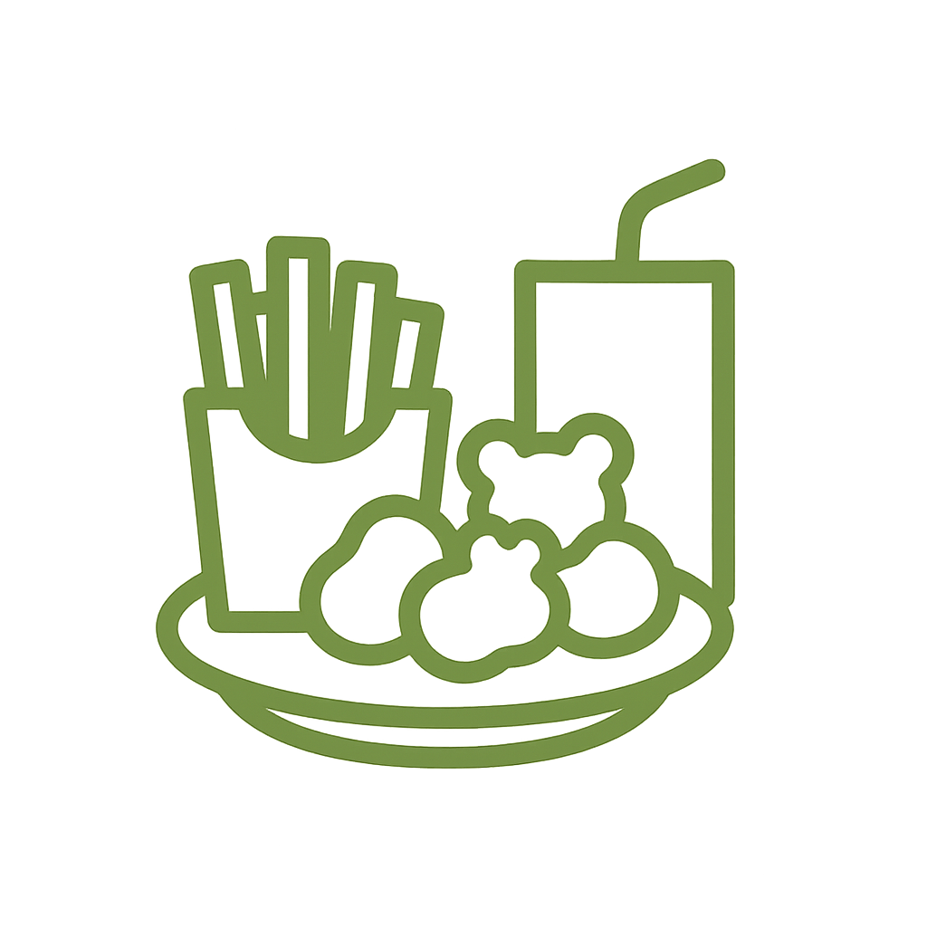 mit Pommes und Reis und mit einer von vier Varianten zur Auswahl: 1. mit in Mavrodaphne-Wein gebratenen Zwiebeln 2. mit einer Champignon-Sauce verfeinert 3. mit einer Knoblauch-Sahne-Sauce verfeinert 4. mit Tomaten-Knoblauch-Sauce